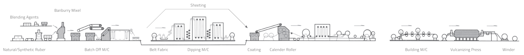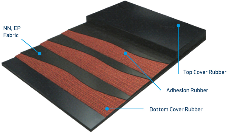 Our renowned multy-ply EP carcass (warp polyester + weft nylon). Special rubber layer with good fabric adhesion properties (skimmed layer). High abrasion resistant cover quality for heavy duty application or special quality of cover on request.